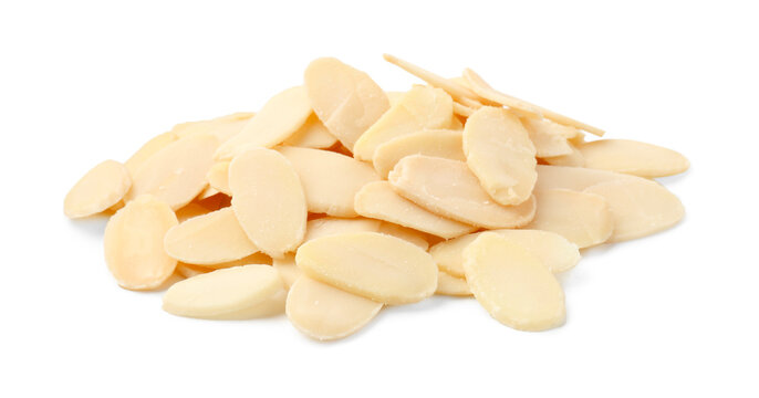 Almond oil in a glass container up close with a bunch of them and a slice, isolated on a white backdrop. Generative AI