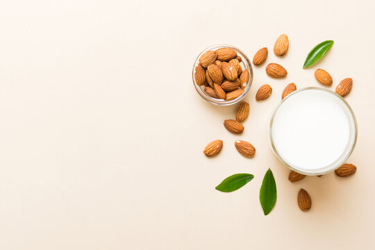 Flat lay (top view) of Almond milk with almond nuts isolated on white background.