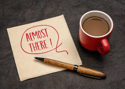 almost there exclamation - handwriting on a napkin with a cup of coffee, reaching goal or destination concept