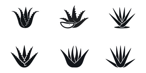 Aloe vera vector illustration. Agave leaves hand drawn black on white background. Cosmetic plant silhouette, Aloe vera silhouette icon set, Black and white silhouette of spiky aloe leaves, Aloe vera.