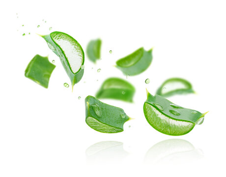 Aloe vera cutting leaf with aloe latex and water droplets isolated on white background.