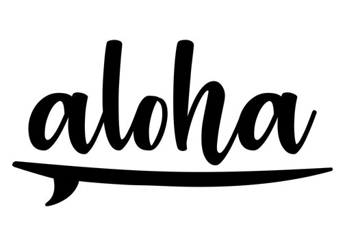 Logo destino de vacaciones. Letras de la palabra hawaiana aloha en texto manuscrito con silueta de tabla de surf