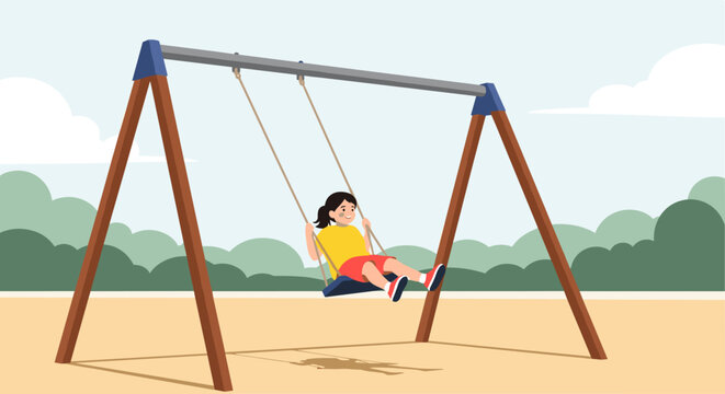 A happy young girl enjoys a sunny day on a playground swing set in a park with trees in the background