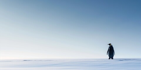 A lone penguin stands in the middle of a snowy expanse under a vast, empty sky, exuding a sense of isolation