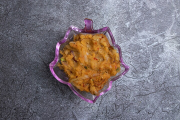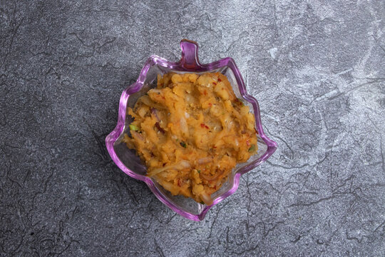 Assorted Bhorta Bhaj or bhaji with aloo, eggplant, baingan, tomato vorta served in plate isolated on background top view of bangladeshi, indian and pakistani traditional spicy food