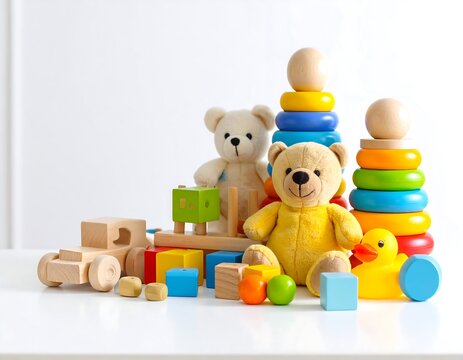 A neatly arranged stack of colorful children's toys on a clean white surface