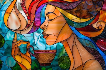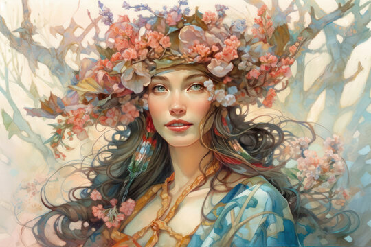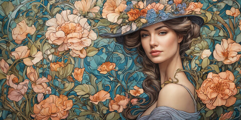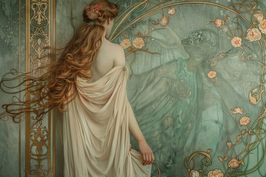 abstract art nouveau decoration illustration of fictional woman for cards or banner designs, generative ai