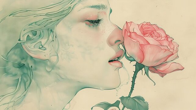 Delicate Watercolor Line Art of Nose Smelling Rose in Romantic Pinks and Greens.