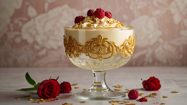 Exquisite Mousse with Edible Gold and Floral Sugar Designs in Vintage Cup