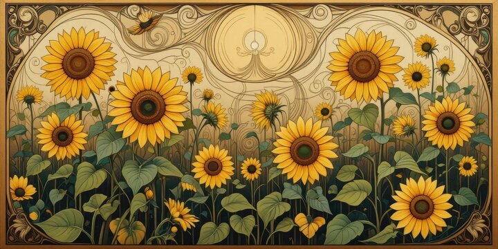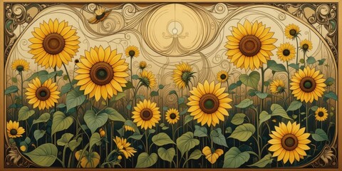 An Art Nouveau Style Painting of a Sunflower Garden Featuring Flowing Lines and Intricate Decorative Elements.