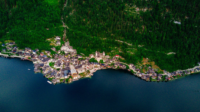 Panoramic aerial view of Famous Hallstatt mountain village, Salzkammergut, Austria in a beautiful summer day