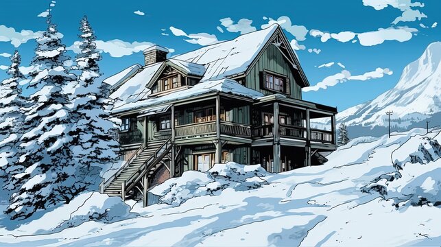 Snow-covered alpine chalet. Fantasy concept , Illustration painting.