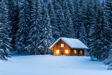 Cozy mountain village scene with skiers and snow covered cabins in winter