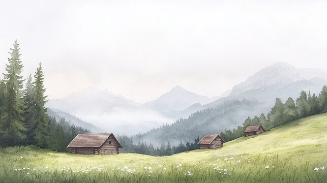 Misty Mountain Valley with Wooden Cabins