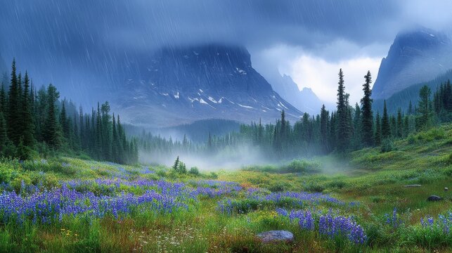 Grassy Outcrop and Scenic Glacier with Rocks and Flowers