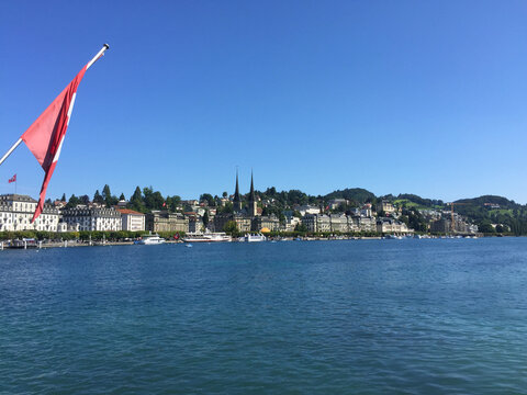 view of cityscape and swiss flag near the river Reuss, Lucerne, Switzerland