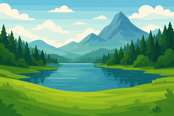 Mountain lake landscape vector background. Summer nature scenery with forest, green hills, blue sky. Flat cartoon illustration for travel, tourism, hiking, ecology concept.