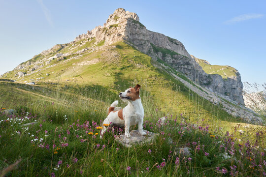 Jack Russell Terrier dog stands alert in alpine wildflowers, mountain peaks in the background. This image evokes the joy of hiking with a loyal pet