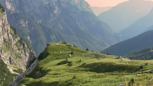 View from Mngart saddle. Beautiful Alp landscape in Slovenia. View of Italian mountains.