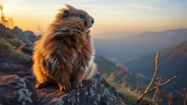 Majestic mountain peaks illuminated by golden sunrise reflected in calm alpine lake isolated on white background