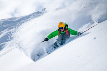 A male skier skiing in powder snow at the Kitzsteinhorn Glacier near Salzburg in Austria.