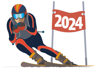 2024 happy new year concept of skier racing downhill passing red flag with the year 2024 isolated on white