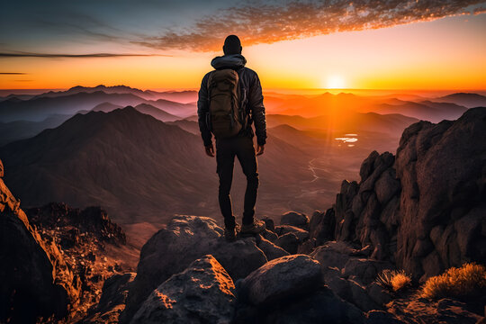 An alpinist on top of a high mountain watching the sunset. Generative AI.