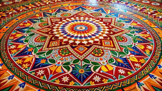 Intricately patterned Alpona design adorns the floor, featuring geometric shapes and floral motifs in vibrant colors, creating a rich and festive atmosphere.