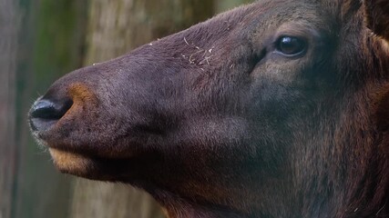 Close view of an altai wapiti elk deer head standing in the forest in autumn on a cloudy day