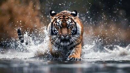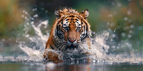 siberian tiger panthera tigris altaica low angle photo direct face view running in the water dire.