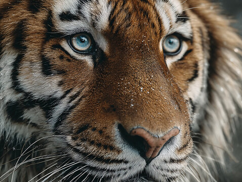a tiger's face, showcasing its distinctive striped fur, piercing eyes, and sharp whiskers. The tiger's gaze is directed forward, giving a sense of intensity and focus.
