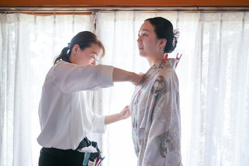 A woman is getting her clothes altered by another woman. The woman being altered is wearing a kimono