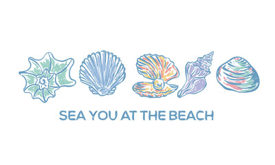 Seashell vintage artwork. Summer vibes artwork. Seashell line drawing. Sea you at the beach. Miami beach modern abstract art.