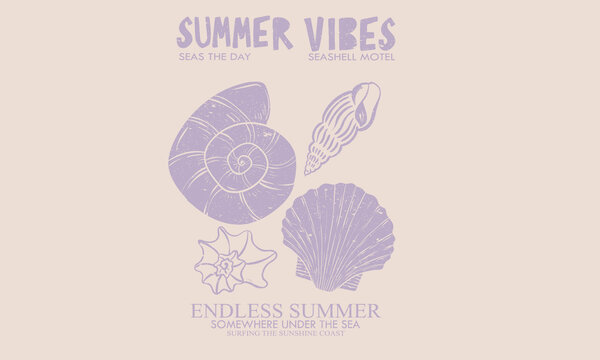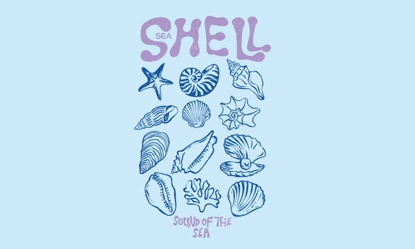 Seashell motel design. Sound of the sea. Seashell vintage artwork. Summer vibes artwork. Seashell line drawing.