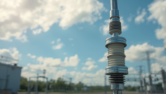 Closeup of high voltage insulators at a new substation, highlighting electrical infrastructure and durability