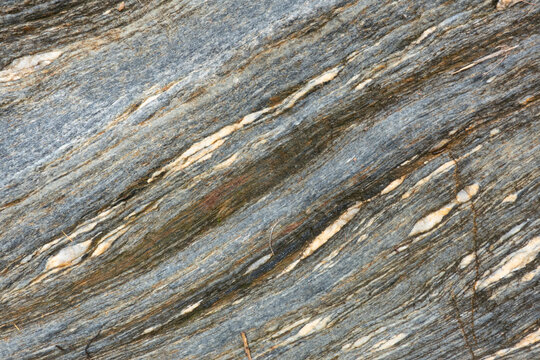 Close up of rock surface, gneissic banding, alternation of mafic and felsic minerals