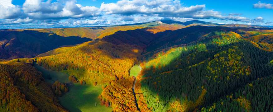 Mountain panorama in autumn colors, with an alternation of deciduous forests with golden foliage and green coniferous forests. Aerial view of the Carpathian mountains with cloud shadows in autumn