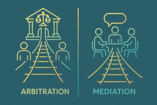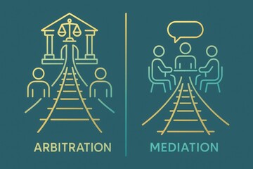 Distinct visual representation contrasting arbitration and mediation processes illustrating legal decision making versus collaborative dialogue in a symbolic and relatable manner
