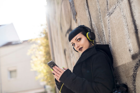 Beautiful gothic girl listening her music by headphones and walking around the city