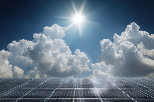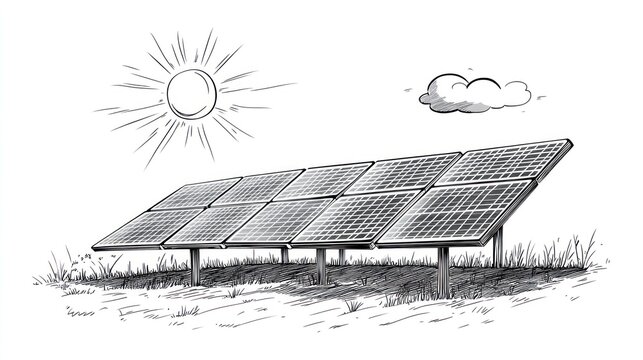 Sketch of solar panels in field, sun and cloud background, renewable energy illustration