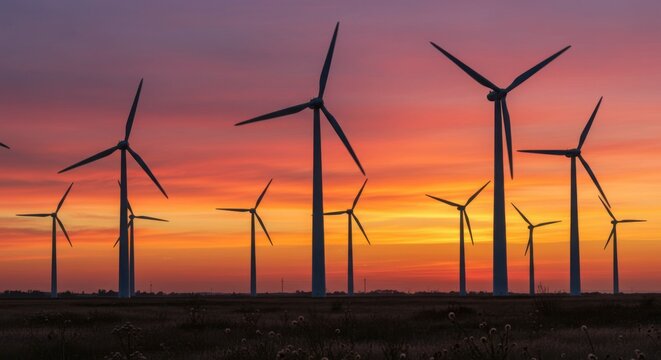 Sustainable energy concept with solar panels, wind turbines, power lines and cityscape, great for green energy campaigns, environmental blogs, clean tech infographics
