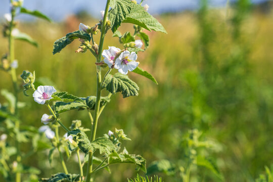 Althaea officinalis, or marsh-mallow. Flowering meadow.  Place for text.