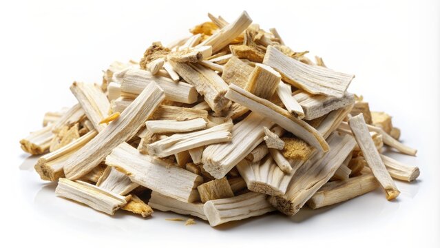 Freshly dried and sliced marshmallow root althaea officinalis in neat pile isolated on clean white studio background with soft focus.