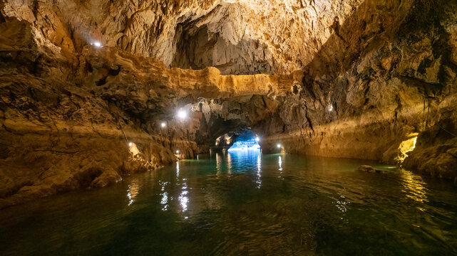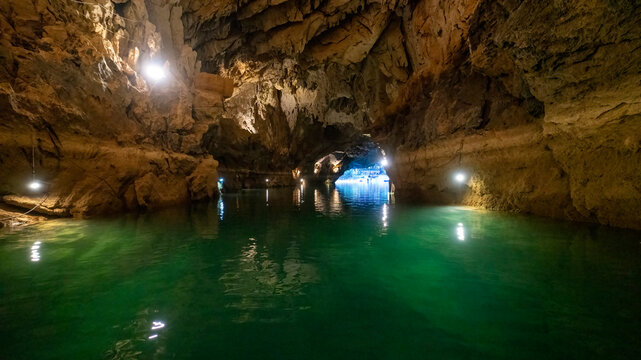 Altinbesik Cave is Turkey's largest underwater lake cave, in addition to its magnificent beauty. The cave is illuminated with colored lights. Antalya, Turkey.