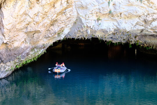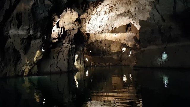 The boat is sailing during the excursion through the cave, Altinbasak in Turkey. Cave lake with beautiful lighting. Boat in a cave with stalagmites and stalactites