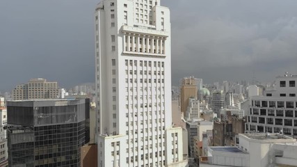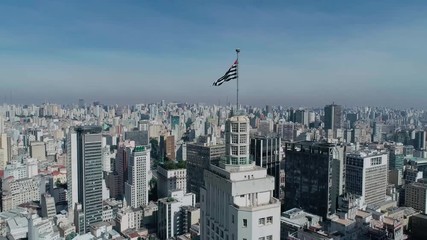 Drone Aerial View of the city Sao Paulo Banespa building with city flag Sao Paulo