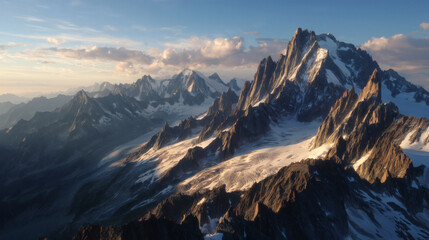 An epic drone shot from a moderate altitude, showcasing the craggy, snow-capped peaks of a mountain range at dawn. The image emphasizes the rugged, powerful beauty and vast scale of the landscape.