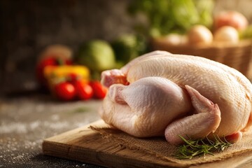 Raw whole chicken on wooden board, surrounded by fresh vegetables