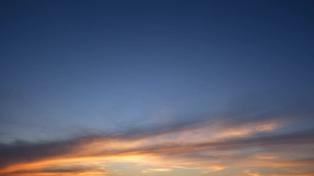 A sunset sky timelapse video highlighting smooth altostratus and cirrostratus clouds, painted in soft pink, orange, and violet tones as daylight fades into a calm evening atmosphere. Time-lapse.