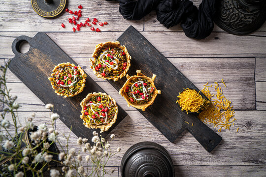Old Dilli Katori Chaat served in a dish isolated on dark background top view food